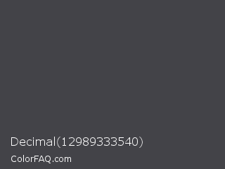 Decimal 12989333540 Color is a dark blue color and the nearest color is Gravel #4a444b. Hex code #434348 and RGB value is rgb(67,67,72). In RGB color space, this color is composed of 26% red, 26% green, 28% blue, In CMYK color space, this color is composed of 7% cyan, 7% magenta, 0% yellow , 72% black , In HSL color space, this color has a hue angle of 240° , 4% saturation and 27% lightness.