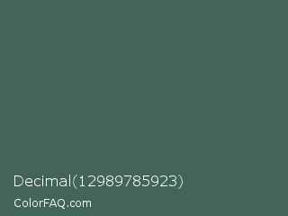 Decimal 12989785923 Color is a normal green color and the nearest color is Mineral Green #3f5d53. Hex code #436557 and RGB value is rgb(67,101,87). In RGB color space, this color is composed of 26% red, 40% green, 34% blue, In CMYK color space, this color is composed of 34% cyan, 0% magenta, 14% yellow , 60% black , In HSL color space, this color has a hue angle of 155° , 20% saturation and 33% lightness.