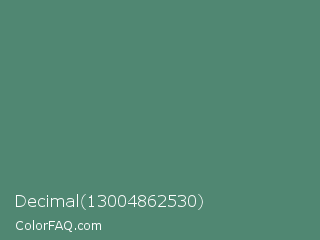Decimal 13004862530 Color is a normal green color and the nearest color is Wintergreen Dream #56887d. Hex code #508772 and RGB value is rgb(80,135,114). In RGB color space, this color is composed of 31% red, 53% green, 45% blue, In CMYK color space, this color is composed of 41% cyan, 0% magenta, 16% yellow , 47% black , In HSL color space, this color has a hue angle of 157° , 26% saturation and 42% lightness.