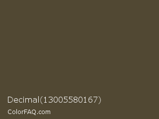 Decimal 13005580167 Color is a dark orange color and the nearest color is Judge Gray #544333. Hex code #514833 and RGB value is rgb(81,72,51). In RGB color space, this color is composed of 32% red, 28% green, 20% blue, In CMYK color space, this color is composed of 0% cyan, 11% magenta, 37% yellow , 68% black , In HSL color space, this color has a hue angle of 42° , 23% saturation and 26% lightness.