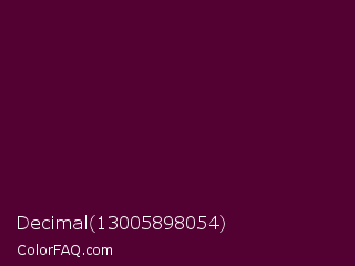 Decimal 13005898054 Color is a very dark magenta color and the nearest color is Blackberry #4d0135. Hex code #520132 and RGB value is rgb(82,1,50). In RGB color space, this color is composed of 32% red, 0% green, 20% blue, In CMYK color space, this color is composed of 0% cyan, 99% magenta, 39% yellow , 68% black , In HSL color space, this color has a hue angle of 324° , 98% saturation and 16% lightness.