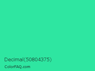 Decimal 50804375 Color is a normal green color and the nearest color is Eucalyptus #44d7a8. Hex code #2ee6a1 and RGB value is rgb(46,230,161). In RGB color space, this color is composed of 18% red, 90% green, 63% blue, In CMYK color space, this color is composed of 80% cyan, 0% magenta, 30% yellow , 10% black , In HSL color space, this color has a hue angle of 158° , 79% saturation and 54% lightness.