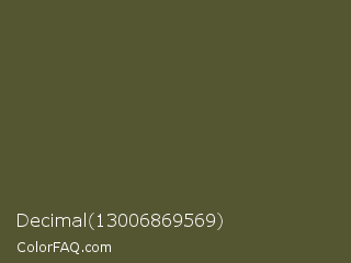 Decimal 13006869569 Color is a dark yellow color and the nearest color is Woodland #4d5328. Hex code #535631 and RGB value is rgb(83,86,49). In RGB color space, this color is composed of 33% red, 34% green, 19% blue, In CMYK color space, this color is composed of 3% cyan, 0% magenta, 43% yellow , 66% black , In HSL color space, this color has a hue angle of 65° , 27% saturation and 26% lightness.