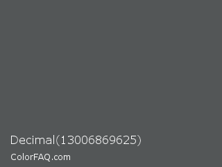 Decimal 13006869625 Color is a normal blue color and the nearest color is Davys Grey #555555. Hex code #535657 and RGB value is rgb(83,86,87). In RGB color space, this color is composed of 33% red, 34% green, 34% blue, In CMYK color space, this color is composed of 5% cyan, 1% magenta, 0% yellow , 66% black , In HSL color space, this color has a hue angle of 195° , 2% saturation and 33% lightness.