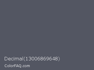 Decimal 13006869648 Color is a normal blue color and the nearest color is Scarpa Flow #585562. Hex code #535662 and RGB value is rgb(83,86,98). In RGB color space, this color is composed of 33% red, 34% green, 38% blue, In CMYK color space, this color is composed of 15% cyan, 12% magenta, 0% yellow , 62% black , In HSL color space, this color has a hue angle of 228° , 8% saturation and 35% lightness.