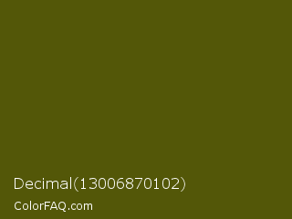 Decimal 13006870102 Color is a very dark yellow color and the nearest color is Saratoga #555b10. Hex code #535708 and RGB value is rgb(83,87,8). In RGB color space, this color is composed of 33% red, 34% green, 3% blue, In CMYK color space, this color is composed of 5% cyan, 0% magenta, 91% yellow , 66% black , In HSL color space, this color has a hue angle of 63° , 83% saturation and 19% lightness.