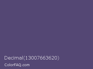 Decimal 13007663620 Color is a normal indigo color and the nearest color is Cyber Grape #58427c. Hex code #544774 and RGB value is rgb(84,71,116). In RGB color space, this color is composed of 33% red, 28% green, 45% blue, In CMYK color space, this color is composed of 28% cyan, 39% magenta, 0% yellow , 55% black , In HSL color space, this color has a hue angle of 257° , 24% saturation and 37% lightness.