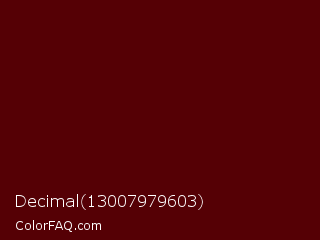 Decimal 13007979603 Color is a very dark red color and the nearest color is Mahogany #4e0606. Hex code #550005 and RGB value is rgb(85,0,5). In RGB color space, this color is composed of 33% red, 0% green, 2% blue, In CMYK color space, this color is composed of 0% cyan, 100% magenta, 94% yellow , 67% black , In HSL color space, this color has a hue angle of 356° , 100% saturation and 17% lightness.