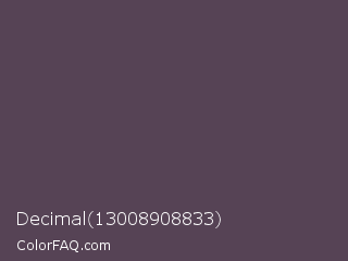 Decimal 13008908833 Color is a dark magenta color and the nearest color is Mortar #504351. Hex code #564355 and RGB value is rgb(86,67,85). In RGB color space, this color is composed of 34% red, 26% green, 33% blue, In CMYK color space, this color is composed of 0% cyan, 22% magenta, 1% yellow , 66% black , In HSL color space, this color has a hue angle of 303° , 12% saturation and 30% lightness.