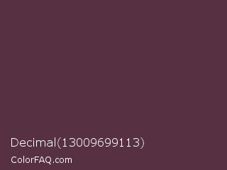 Decimal 13009699113 Color is a dark rose color and the nearest color is Congo Brown #593737. Hex code #573141 and RGB value is rgb(87,49,65). In RGB color space, this color is composed of 34% red, 19% green, 25% blue, In CMYK color space, this color is composed of 0% cyan, 44% magenta, 25% yellow , 66% black , In HSL color space, this color has a hue angle of 335° , 28% saturation and 27% lightness.