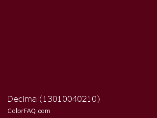 Decimal 13010040210 Color is a very dark red color and the nearest color is Dark Scarlet #560319. Hex code #580218 and RGB value is rgb(88,2,24). In RGB color space, this color is composed of 35% red, 1% green, 9% blue, In CMYK color space, this color is composed of 0% cyan, 98% magenta, 73% yellow , 65% black , In HSL color space, this color has a hue angle of 345° , 96% saturation and 18% lightness.