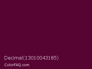 Decimal 13010043185 Color is a very dark magenta color and the nearest color is Mulberry Wood #5c0536. Hex code #580433 and RGB value is rgb(88,4,51). In RGB color space, this color is composed of 35% red, 2% green, 20% blue, In CMYK color space, this color is composed of 0% cyan, 95% magenta, 42% yellow , 65% black , In HSL color space, this color has a hue angle of 326° , 91% saturation and 18% lightness.