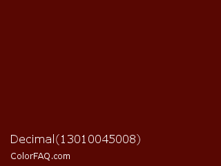Decimal 13010045008 Color is a very dark red color and the nearest color is Mahogany #4e0606. Hex code #580702 and RGB value is rgb(88,7,2). In RGB color space, this color is composed of 35% red, 3% green, 1% blue, In CMYK color space, this color is composed of 0% cyan, 92% magenta, 98% yellow , 65% black , In HSL color space, this color has a hue angle of 3° , 96% saturation and 18% lightness.
