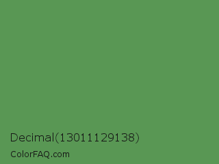 Decimal 13011129138 Color is a normal green color and the nearest color is Fruit Salad #4f9d5d. Hex code #599754 and RGB value is rgb(89,151,84). In RGB color space, this color is composed of 35% red, 59% green, 33% blue, In CMYK color space, this color is composed of 41% cyan, 0% magenta, 44% yellow , 41% black , In HSL color space, this color has a hue angle of 116° , 29% saturation and 46% lightness.