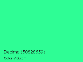 Decimal 50828659 Color is a normal green color and the nearest color is Medium Spring Green #00fa9a. Hex code #2efd95 and RGB value is rgb(46,253,149). In RGB color space, this color is composed of 18% red, 99% green, 58% blue, In CMYK color space, this color is composed of 82% cyan, 0% magenta, 41% yellow , 1% black , In HSL color space, this color has a hue angle of 150° , 98% saturation and 59% lightness.