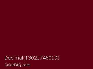 Decimal 13021746019 Color is a very dark red color and the nearest color is Rosewood #65000b. Hex code #600013 and RGB value is rgb(96,0,19). In RGB color space, this color is composed of 38% red, 0% green, 7% blue, In CMYK color space, this color is composed of 0% cyan, 100% magenta, 80% yellow , 62% black , In HSL color space, this color has a hue angle of 348° , 100% saturation and 19% lightness.