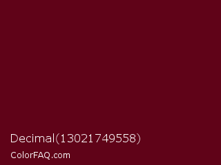 Decimal 13021749558 Color is a very dark red color and the nearest color is Bordeaux #5c0120. Hex code #600318 and RGB value is rgb(96,3,24). In RGB color space, this color is composed of 38% red, 1% green, 9% blue, In CMYK color space, this color is composed of 0% cyan, 97% magenta, 75% yellow , 62% black , In HSL color space, this color has a hue angle of 346° , 94% saturation and 19% lightness.