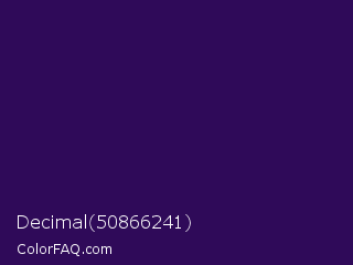 Decimal 50866241 Color is a very dark violet color and the nearest color is Jagger #350e57. Hex code #2f0a59 and RGB value is rgb(47,10,89). In RGB color space, this color is composed of 18% red, 4% green, 35% blue, In CMYK color space, this color is composed of 47% cyan, 89% magenta, 0% yellow , 65% black , In HSL color space, this color has a hue angle of 268° , 80% saturation and 19% lightness.