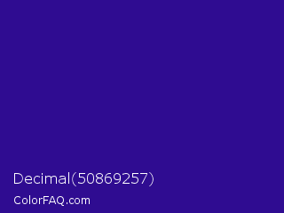 Decimal 50869257 Color is a normal indigo color and the nearest color is Blue Gem #2c0e8c. Hex code #2f0c91 and RGB value is rgb(47,12,145). In RGB color space, this color is composed of 18% red, 5% green, 57% blue, In CMYK color space, this color is composed of 68% cyan, 92% magenta, 0% yellow , 43% black , In HSL color space, this color has a hue angle of 256° , 85% saturation and 31% lightness.