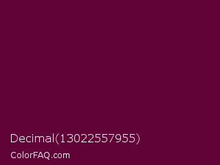 Decimal 13022557955 Color is a very dark magenta color and the nearest color is Mulberry Wood #5c0536. Hex code #610337 and RGB value is rgb(97,3,55). In RGB color space, this color is composed of 38% red, 1% green, 22% blue, In CMYK color space, this color is composed of 0% cyan, 97% magenta, 43% yellow , 62% black , In HSL color space, this color has a hue angle of 327° , 94% saturation and 20% lightness.