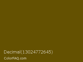 Decimal 13024772645 Color is a very dark yellow color and the nearest color is Antique Bronze #704a07. Hex code #645101 and RGB value is rgb(100,81,1). In RGB color space, this color is composed of 39% red, 32% green, 0% blue, In CMYK color space, this color is composed of 0% cyan, 19% magenta, 99% yellow , 61% black , In HSL color space, this color has a hue angle of 48° , 98% saturation and 20% lightness.