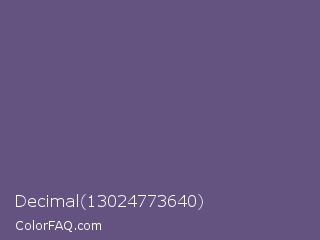 Decimal 13024773640 Color is a normal violet color and the nearest color is Smoky #605b73. Hex code #645280 and RGB value is rgb(100,82,128). In RGB color space, this color is composed of 39% red, 32% green, 50% blue, In CMYK color space, this color is composed of 22% cyan, 36% magenta, 0% yellow , 50% black , In HSL color space, this color has a hue angle of 263° , 22% saturation and 41% lightness.