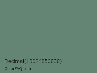 Decimal 13024850838 Color is a normal green color and the nearest color is Viridian Green #678975. Hex code #648474 and RGB value is rgb(100,132,116). In RGB color space, this color is composed of 39% red, 52% green, 45% blue, In CMYK color space, this color is composed of 24% cyan, 0% magenta, 12% yellow , 48% black , In HSL color space, this color has a hue angle of 150° , 14% saturation and 45% lightness.