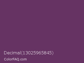 Decimal 13025965845 Color is a dark magenta color and the nearest color is Imperial #602f6b. Hex code #663363 and RGB value is rgb(102,51,99). In RGB color space, this color is composed of 40% red, 20% green, 39% blue, In CMYK color space, this color is composed of 0% cyan, 50% magenta, 3% yellow , 60% black , In HSL color space, this color has a hue angle of 304° , 33% saturation and 30% lightness.