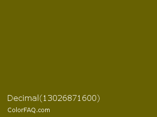 Decimal 13026871600 Color is a very dark yellow color and the nearest color is Spicy Mustard #74640d. Hex code #676102 and RGB value is rgb(103,97,2). In RGB color space, this color is composed of 40% red, 38% green, 1% blue, In CMYK color space, this color is composed of 0% cyan, 6% magenta, 98% yellow , 60% black , In HSL color space, this color has a hue angle of 56° , 96% saturation and 21% lightness.
