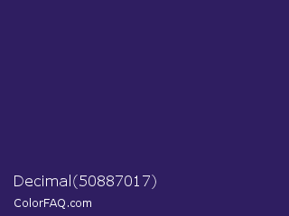 Decimal 50887017 Color is a dark indigo color and the nearest color is Jacarta #3a2a6a. Hex code #2f1e61 and RGB value is rgb(47,30,97). In RGB color space, this color is composed of 18% red, 12% green, 38% blue, In CMYK color space, this color is composed of 52% cyan, 69% magenta, 0% yellow , 62% black , In HSL color space, this color has a hue angle of 255° , 53% saturation and 25% lightness.