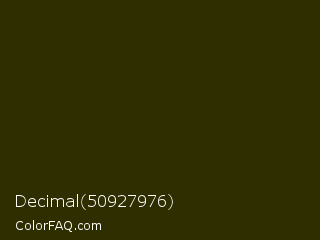Decimal 50927976 Color is a almost black yellow color and the nearest color is Woodrush #302a0f. Hex code #2f2e00 and RGB value is rgb(47,46,0). In RGB color space, this color is composed of 18% red, 18% green, 0% blue, In CMYK color space, this color is composed of 0% cyan, 2% magenta, 100% yellow , 82% black , In HSL color space, this color has a hue angle of 59° , 100% saturation and 9% lightness.