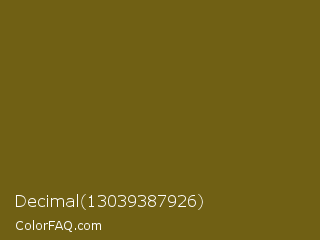 Decimal 13039387926 Color is a dark yellow color and the nearest color is Spicy Mustard #74640d. Hex code #706014 and RGB value is rgb(112,96,20). In RGB color space, this color is composed of 44% red, 38% green, 8% blue, In CMYK color space, this color is composed of 0% cyan, 14% magenta, 82% yellow , 56% black , In HSL color space, this color has a hue angle of 50° , 70% saturation and 26% lightness.