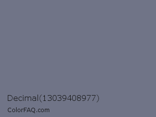 Decimal 13039408977 Color is a normal blue color and the nearest color is Storm Gray #717486. Hex code #707487 and RGB value is rgb(112,116,135). In RGB color space, this color is composed of 44% red, 45% green, 53% blue, In CMYK color space, this color is composed of 17% cyan, 14% magenta, 0% yellow , 47% black , In HSL color space, this color has a hue angle of 230° , 9% saturation and 48% lightness.