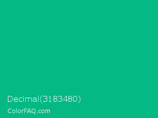 Decimal 3183480 Color is a normal green color and the nearest color is Green Munsell #00a877. Hex code #04b882 and RGB value is rgb(4,184,130). In RGB color space, this color is composed of 2% red, 72% green, 51% blue, In CMYK color space, this color is composed of 98% cyan, 0% magenta, 29% yellow , 28% black , In HSL color space, this color has a hue angle of 162° , 96% saturation and 37% lightness.