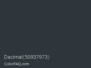 Decimal 50937973 Color is a very dark blue color and the nearest color is Outer Space Crayola #2d383a. Hex code #2f363b and RGB value is rgb(47,54,59). In RGB color space, this color is composed of 18% red, 21% green, 23% blue, In CMYK color space, this color is composed of 20% cyan, 8% magenta, 0% yellow , 77% black , In HSL color space, this color has a hue angle of 205° , 11% saturation and 21% lightness.