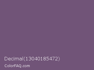 Decimal 13040185472 Color is a normal purple color and the nearest color is Salt Box #685e6e. Hex code #715478 and RGB value is rgb(113,84,120). In RGB color space, this color is composed of 44% red, 33% green, 47% blue, In CMYK color space, this color is composed of 6% cyan, 30% magenta, 0% yellow , 53% black , In HSL color space, this color has a hue angle of 288° , 18% saturation and 40% lightness.