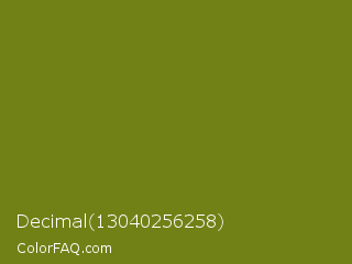 Decimal 13040256258 Color is a dark yellow color and the nearest color is Pacifika #778120. Hex code #718116 and RGB value is rgb(113,129,22). In RGB color space, this color is composed of 44% red, 51% green, 9% blue, In CMYK color space, this color is composed of 12% cyan, 0% magenta, 83% yellow , 49% black , In HSL color space, this color has a hue angle of 69° , 71% saturation and 30% lightness.