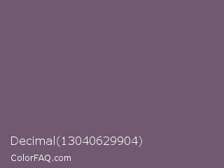 Decimal 13040629904 Color is a normal magenta color and the nearest color is Salt Box #685e6e. Hex code #725972 and RGB value is rgb(114,89,114). In RGB color space, this color is composed of 45% red, 35% green, 45% blue, In CMYK color space, this color is composed of 0% cyan, 22% magenta, 0% yellow , 55% black , In HSL color space, this color has a hue angle of 300° , 12% saturation and 40% lightness.