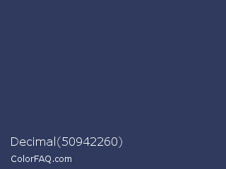 Decimal 50942260 Color is a dark blue color and the nearest color is Rhino #2e3f62. Hex code #2f3a5e and RGB value is rgb(47,58,94). In RGB color space, this color is composed of 18% red, 23% green, 37% blue, In CMYK color space, this color is composed of 50% cyan, 38% magenta, 0% yellow , 63% black , In HSL color space, this color has a hue angle of 226° , 33% saturation and 28% lightness.