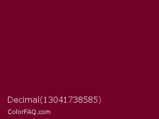 Decimal 13041738585 Color is a dark rose color and the nearest color is Burgundy #800020. Hex code #740127 and RGB value is rgb(116,1,39). In RGB color space, this color is composed of 45% red, 0% green, 15% blue, In CMYK color space, this color is composed of 0% cyan, 99% magenta, 66% yellow , 55% black , In HSL color space, this color has a hue angle of 340° , 98% saturation and 23% lightness.