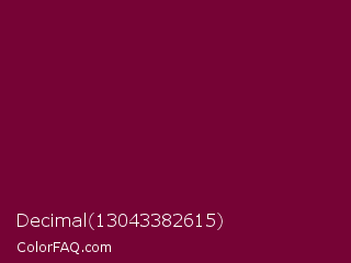 Decimal 13043382615 Color is a dark rose color and the nearest color is Siren #7a013a. Hex code #760335 and RGB value is rgb(118,3,53). In RGB color space, this color is composed of 46% red, 1% green, 21% blue, In CMYK color space, this color is composed of 0% cyan, 97% magenta, 55% yellow , 54% black , In HSL color space, this color has a hue angle of 334° , 95% saturation and 24% lightness.