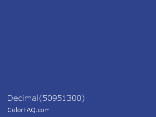 Decimal 50951300 Color is a normal blue color and the nearest color is Chambray #354e8c. Hex code #2f438c and RGB value is rgb(47,67,140). In RGB color space, this color is composed of 18% red, 26% green, 55% blue, In CMYK color space, this color is composed of 66% cyan, 52% magenta, 0% yellow , 45% black , In HSL color space, this color has a hue angle of 227° , 50% saturation and 37% lightness.