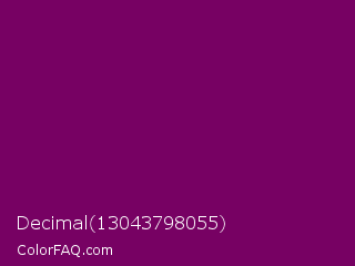 Decimal 13043798055 Color is a dark magenta color and the nearest color is Cardinal Pink #8c055e. Hex code #770163 and RGB value is rgb(119,1,99). In RGB color space, this color is composed of 47% red, 0% green, 39% blue, In CMYK color space, this color is composed of 0% cyan, 99% magenta, 17% yellow , 53% black , In HSL color space, this color has a hue angle of 310° , 98% saturation and 24% lightness.