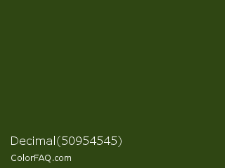 Decimal 50954545 Color is a very dark green color and the nearest color is Clover #384910. Hex code #2f4613 and RGB value is rgb(47,70,19). In RGB color space, this color is composed of 18% red, 27% green, 7% blue, In CMYK color space, this color is composed of 33% cyan, 0% magenta, 73% yellow , 73% black , In HSL color space, this color has a hue angle of 87° , 57% saturation and 17% lightness.