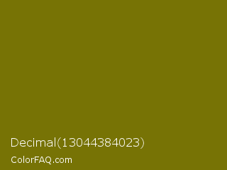 Decimal 13044384023 Color is a dark yellow color and the nearest color is Bronze Yellow #737000. Hex code #777305 and RGB value is rgb(119,115,5). In RGB color space, this color is composed of 47% red, 45% green, 2% blue, In CMYK color space, this color is composed of 0% cyan, 3% magenta, 96% yellow , 53% black , In HSL color space, this color has a hue angle of 58° , 92% saturation and 24% lightness.