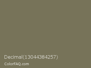 Decimal 13044384257 Color is a normal yellow color and the nearest color is Crocodile #736d58. Hex code #777359 and RGB value is rgb(119,115,89). In RGB color space, this color is composed of 47% red, 45% green, 35% blue, In CMYK color space, this color is composed of 0% cyan, 3% magenta, 25% yellow , 53% black , In HSL color space, this color has a hue angle of 52° , 14% saturation and 41% lightness.