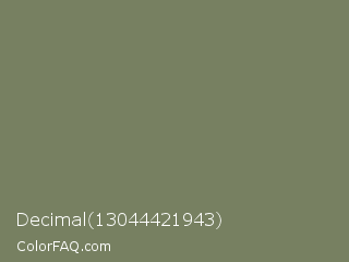 Decimal 13044421943 Color is a normal lime color and the nearest color is Limed Ash #747d63. Hex code #778061 and RGB value is rgb(119,128,97). In RGB color space, this color is composed of 47% red, 50% green, 38% blue, In CMYK color space, this color is composed of 7% cyan, 0% magenta, 24% yellow , 50% black , In HSL color space, this color has a hue angle of 77° , 14% saturation and 44% lightness.