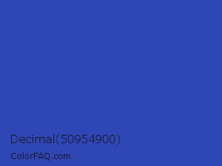 Decimal 50954900 Color is a normal blue color and the nearest color is Violet Blue #324ab2. Hex code #2f46b6 and RGB value is rgb(47,70,182). In RGB color space, this color is composed of 18% red, 27% green, 71% blue, In CMYK color space, this color is composed of 74% cyan, 62% magenta, 0% yellow , 29% black , In HSL color space, this color has a hue angle of 230° , 59% saturation and 45% lightness.