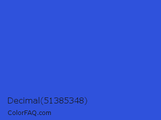 Decimal 51385348 Color is a normal blue color and the nearest color is Palatinate Blue #273be2. Hex code #2f52dc and RGB value is rgb(47,82,220). In RGB color space, this color is composed of 18% red, 32% green, 86% blue, In CMYK color space, this color is composed of 79% cyan, 63% magenta, 0% yellow , 14% black , In HSL color space, this color has a hue angle of 228° , 71% saturation and 52% lightness.