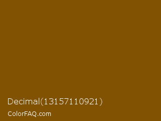Decimal 13157110921 Color is a dark orange color and the nearest color is Rusty Nail #86560a. Hex code #805201 and RGB value is rgb(128,82,1). In RGB color space, this color is composed of 50% red, 32% green, 0% blue, In CMYK color space, this color is composed of 0% cyan, 36% magenta, 99% yellow , 50% black , In HSL color space, this color has a hue angle of 38° , 98% saturation and 25% lightness.